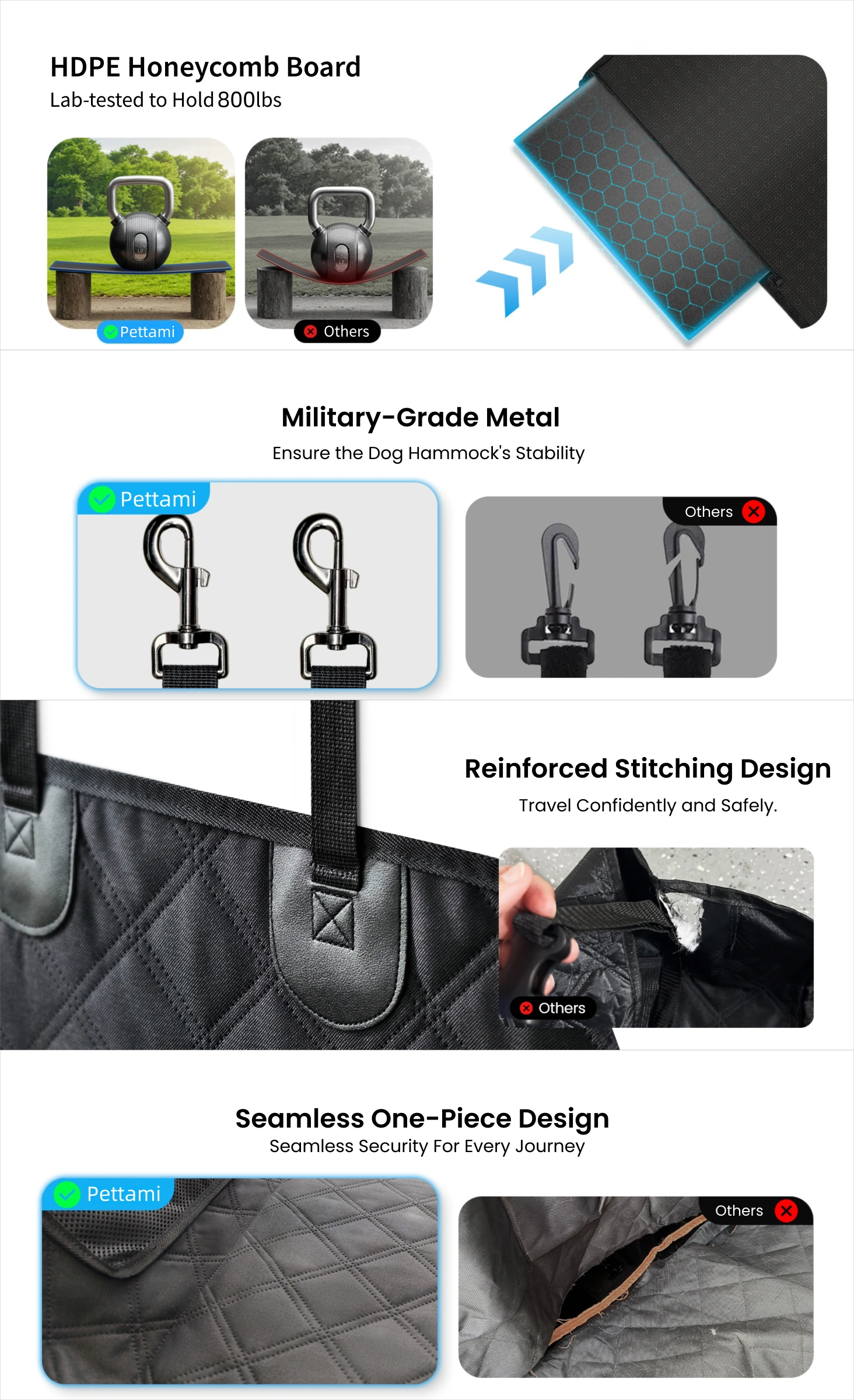The Pettami back seat extender features an innovative 3-plate support system, meticulously engineered to bear up to 800 lbs. Each waterproof, high-density plate ensures maximum durability and modular flexibility, allowing for effortless folding. This intelligent design transforms your backseat into a stable, spacious platform, granting your canine companion unparalleled freedom and comfort on every journey.